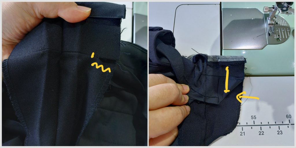 そして、出しでも詰めでも行うのですが、重なったウエストの縫い代部分がズレないようにする処置をします。(写真右側)
