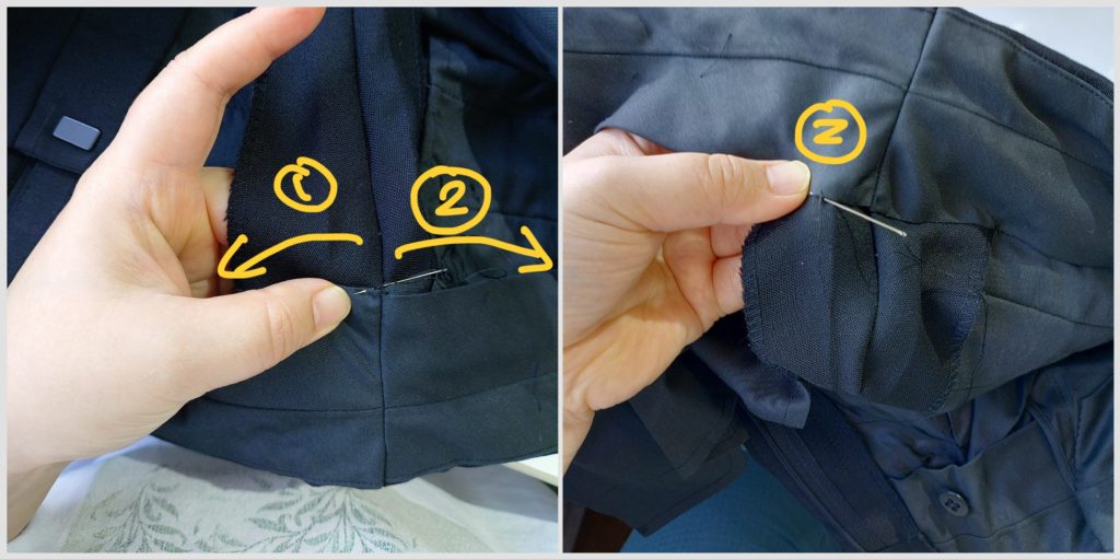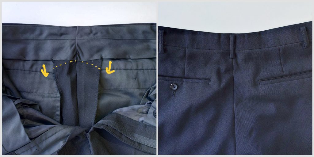 スラックスのウエストの出し、詰め。好きなお直しのうちの一つです。というのも、スーツのパンツ、スラックス、英語だとsuit pants, dress pantsと呼ばれるパンツは、ウエストのお直しがやりやすい作りになっているからです。この後ろ中心で出したり詰めたりするウエスト直しは、お直し初心者もすぐに出来るようになると個人的には思います。