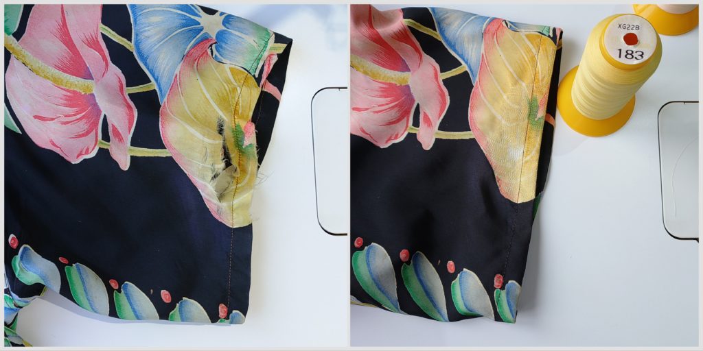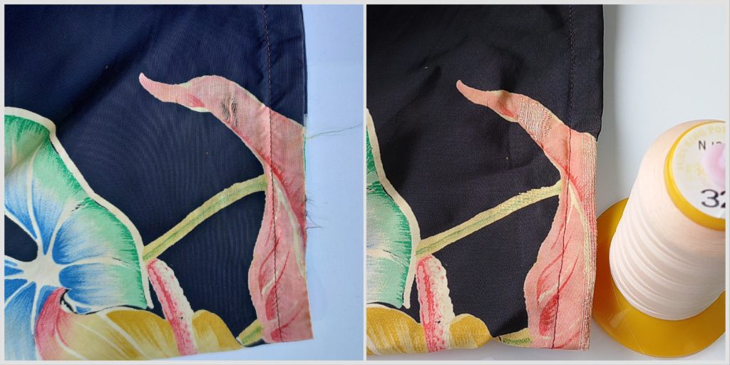 今回、100番のポリエステルの糸でタタキました。どれくらいの耐久性があるかな。シャツには、襟の後ろなどにも破れやスレがありました。少しでも長くお気に入りが着られますように。