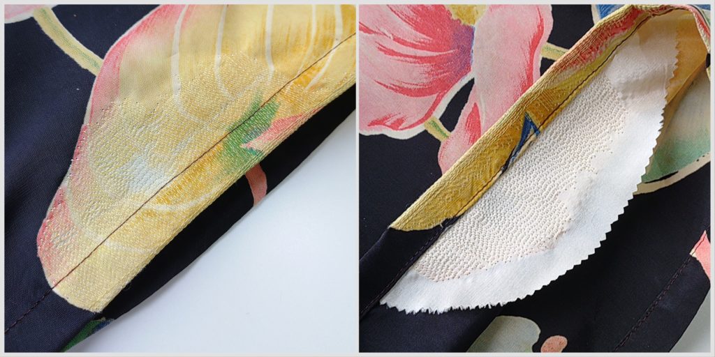 あて布について、厚いと固くなりすぎるから、破れて穴が開いてなかったから薄い方がいいと教わりました。また、かつて私は、最初に教えてもらった時のように、あて布の周りは、ロックミシンで仕上げていました。でも、色んなお直しを承っていくなかで、他の人がやったお直し跡がある品物がめぐってきたりして、この人はこうするんだ~と参考にさせていただくこともあります。その中で、ピンキングばさみを利用してる人がいて、これはいいな!と思い、私も真似して3㎜の細かいピンキングばさみを購入し、そこからあて布はピンキングばさみで端の処理をしています。