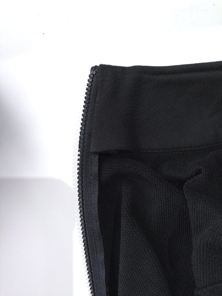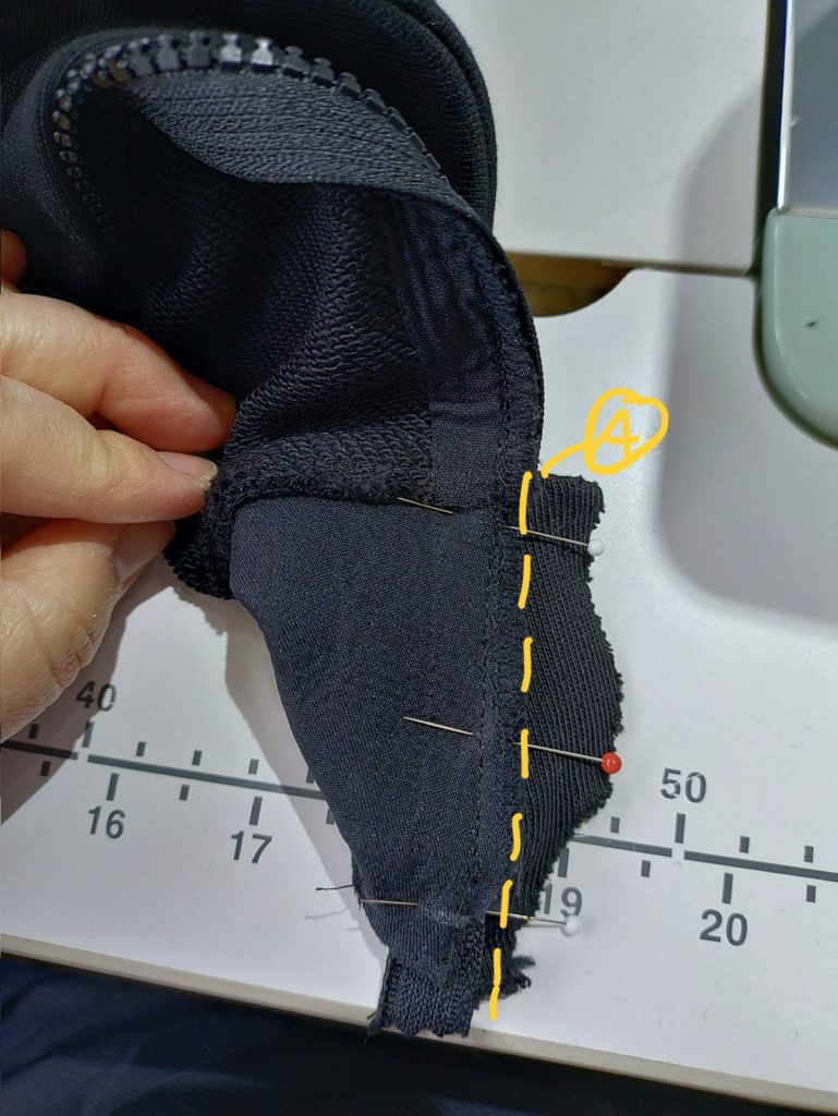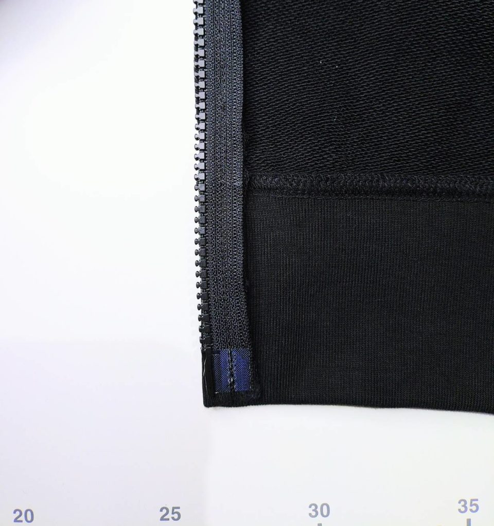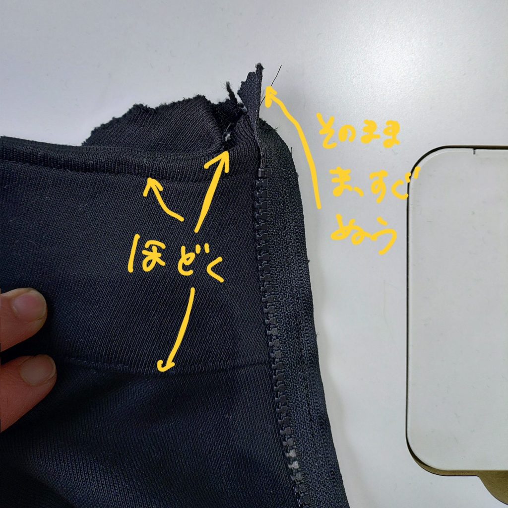 表が長くて内側の襟が短いので、ファスナーの終わりのところは縫いづらいかもしれませんが、ずれないように慎重に縫います。